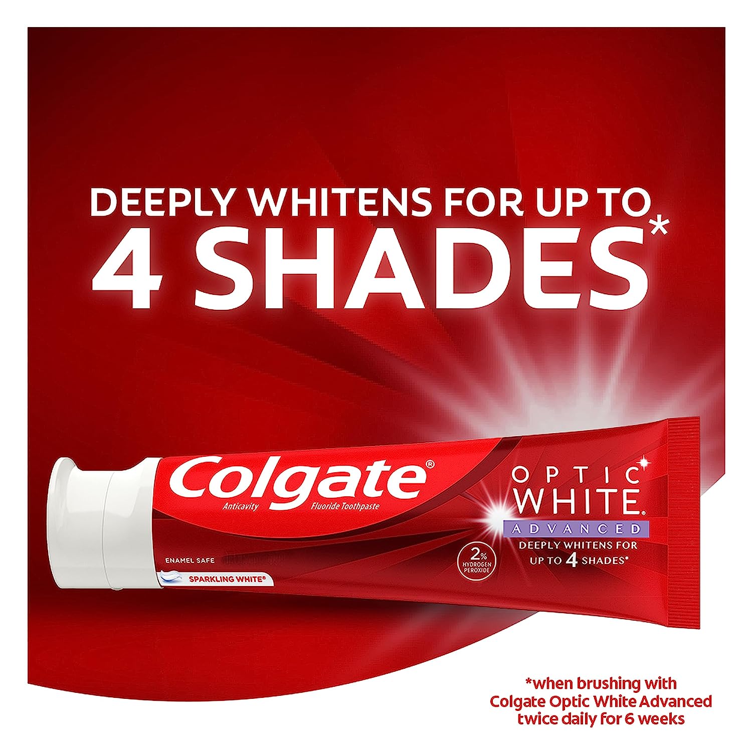 • Optic White Advanced deeply whitens up to four shades* and helps whiten teeth both inside and out (*when brushing twice daily for 6 weeks)
